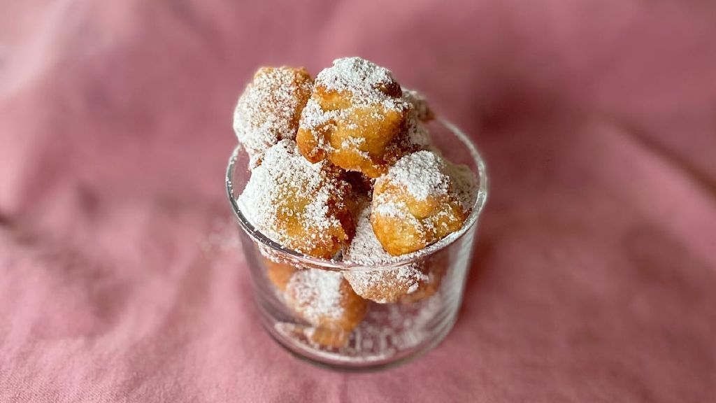 When dusted with powdered sugar, fried pizza dough is reminiscent of a doughnut, funnel cake, or beignets.