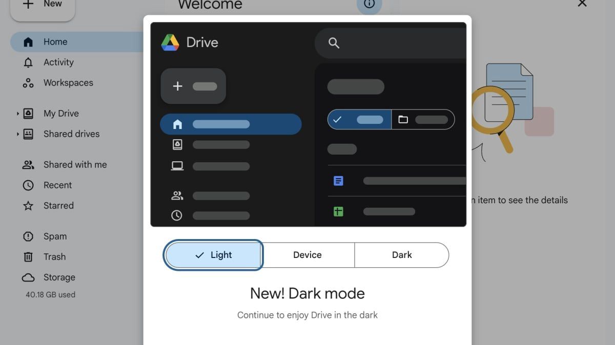 Google is rolling out dark mode to all Google Drive web app users. If you aren't prompted about the new feature, however, you'll need to dig into settings to change your theme.
