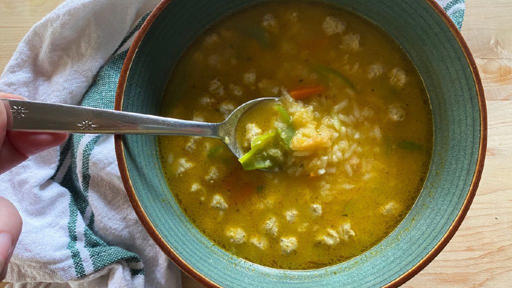 The combination is savory and satisfying, with little turkey meatballs, carrots, slivered green beans, and corn.